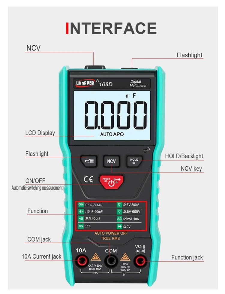 Multimètre Digital WinAPEX 108D True RMS Calibrage automatique