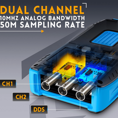 L’oscilloscope Fnirsi 2C23T est un oscilloscope, générateur de fonctions et multimètre portatif à un prix abordable. Cet appareil combine de multiples fonctions pratiques tout en conservant un design fin et portable. L’oscilloscope a une bande passante de 10 MHz, une fréquence d’échantillonnage de 50 MS/s et 2 voies. En outre, il dispose d’une fonction d’enregistrement des formes d’onde, ce qui permet de stocker et d’analyser ultérieurement les données. Le générateur de fonctions dispose d’une seul voie, d’une gamme de fréquences de 1 Hz-2 MHz et d’une amplitude de 0,1-3,3 V. Le générateur de fonctions peut également produire 7 formes d’ondes différentes. Le multimètre dispose de 10 000 comptes et prend en charge les mesures de puissance et de courant CA/CC.